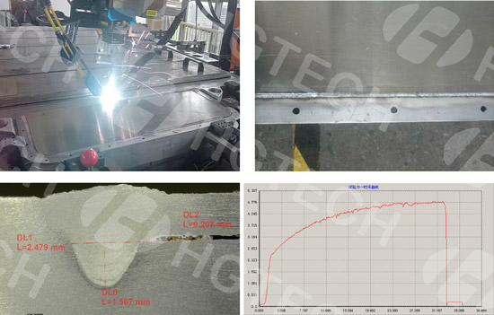 圖3為某客戶電池托盤背板激光焊試制案例,托盤框梁為6XXX鋁合金,背板材料為5XXX鋁合金,背板厚度1.5mm,接頭形式為對(duì)接接頭,原始工藝為攪拌摩擦焊,焊接效率不高,焊接強(qiáng)度低。我司采用激光填絲熔焊,對(duì)該電池托盤背板焊接工藝進(jìn)行升級(jí)。我司通過大量試驗(yàn)和檢測(cè)分析獲取了該產(chǎn)品背板的最佳焊接工藝規(guī)范,在該焊接工藝規(guī)范下,焊縫外觀成型均勻一致,焊接效率大幅提升,焊縫內(nèi)部質(zhì)量?jī)?yōu)異,且強(qiáng)度提升明顯,每10mm焊縫可承載4.7kN。