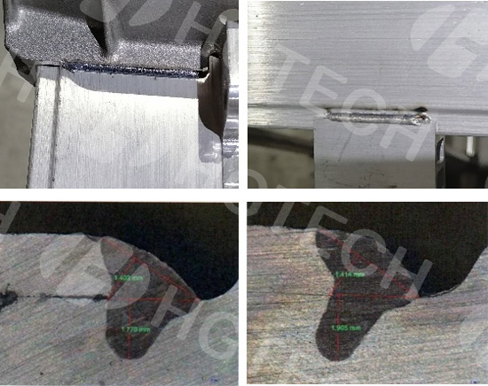 圖2是我司某客戶的鋁合金電池托盤橫縱梁焊接案例,材質(zhì)為6061鋁合金,焊縫接頭形式為搭接接頭,零件均為精加工成型,尺寸狀態(tài)一致性好,若采用CMT焊接,焊后尺寸變形大,無(wú)法達(dá)到裝車要求。我司采用激光填絲熔焊進(jìn)行該零件焊接,使用光束質(zhì)量?jī)?yōu)異的激光器,焊接速度可達(dá)3m/min,是CMT的3-5倍,而且焊縫成型飽滿,焊接強(qiáng)度與CMT相當(dāng),更優(yōu)的,采用激光填絲熔焊后,焊接完成的零件變形小,尺寸一致性高,可良好適配裝車需求。