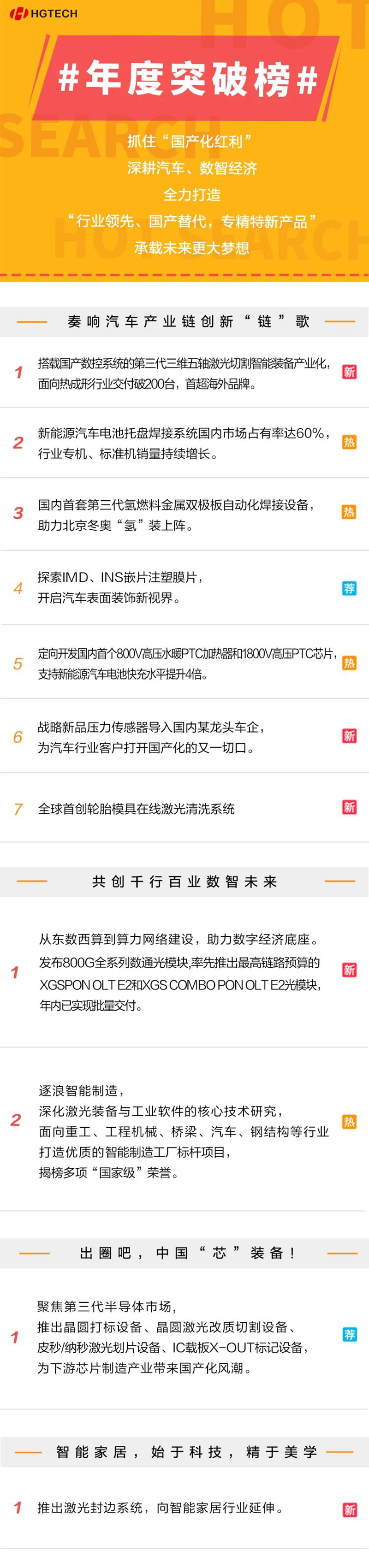 我們深刻把握制造業(yè)發(fā)展趨勢,不斷豐富產(chǎn)品和解決方案,堅持探索自動化、信息化、智能化與制造業(yè)的融合,為各行業(yè)提供包括全功率系列的激光切割系統(tǒng)、激光焊接系統(tǒng)、激光打標(biāo)系列、激光毛化成套設(shè)備、激光熱處理系統(tǒng)、激光打孔機、激光器及各類配套器件、激光加工專用設(shè)備及等離子切割設(shè)備,及自動化產(chǎn)線、智慧工廠建設(shè)整體方案。