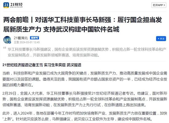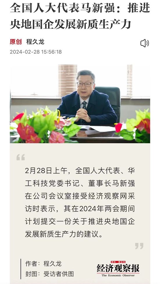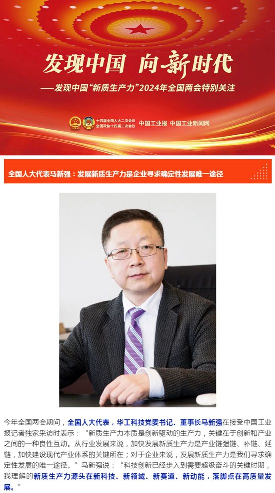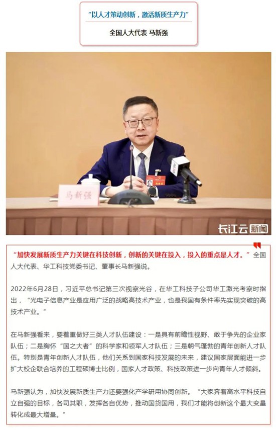 人民日報(bào)、新華社、中央電視臺、經(jīng)濟(jì)日報(bào)、科技日報(bào)、新華網(wǎng)、工業(yè)和信息化部宣傳中心、人民郵電報(bào)、中國工業(yè)報(bào)、中國經(jīng)濟(jì)網(wǎng)、證券時(shí)報(bào)、證券日報(bào)、上海證券報(bào)、21世紀(jì)經(jīng)濟(jì)報(bào)、經(jīng)濟(jì)觀察報(bào)、湖北日報(bào)、極目新聞、長江日報(bào)等多家媒體關(guān)注馬新強(qiáng)代表的履職情況及華工科技創(chuàng)新發(fā)展。