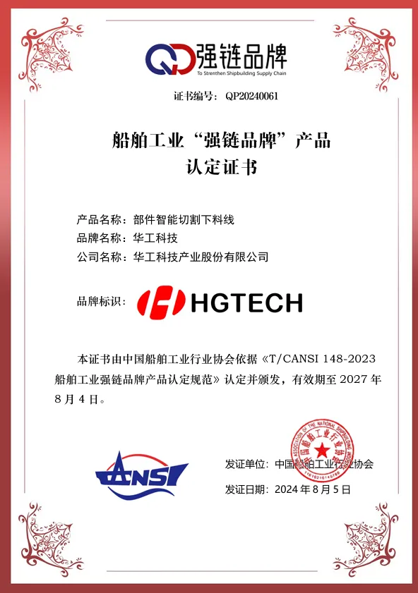 8月8日,中國船舶工業(yè)行業(yè)協(xié)會公布2024年度船舶工業(yè)“強(qiáng)鏈品牌”產(chǎn)品認(rèn)定結(jié)果,華工科技申報的“部件智能切割下料線”和“小組立智能裝焊產(chǎn)線”通過中國船舶工業(yè)行業(yè)協(xié)會的專家團(tuán)隊審查,被認(rèn)定并列入船舶工業(yè)“強(qiáng)鏈品牌”產(chǎn)品目錄。