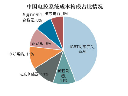 電控系統(tǒng)是新能源汽車的“大腦”,控制整個車輛的運行與動力輸出,主要由逆變器、逆變驅動器、電源模塊、中央控制模塊、軟起動模塊、保護模塊、散熱系統(tǒng)信號檢測模塊等組成,其中逆變器負責蓄電池的直-交轉換,從而驅動電機運轉。其中IGBT功率半導體模塊應用于逆變器中,是新能源汽車電控系統(tǒng)和直流充電樁的核心器件,被稱為電力電子的“CPU”,占整個控制器成本的40-50%左右。